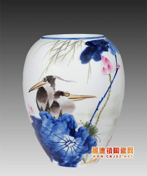 當(dāng)然如果你僅僅以為徐斌的藝術(shù)特色只是停留在運(yùn)用各種陶瓷工藝來表現(xiàn)他的藝術(shù)理念那你就錯(cuò)了!徐斌在研習(xí)各種陶瓷技藝的同時(shí)從未放下對(duì)陶瓷繪畫技術(shù)的追求和攀登。這位畢業(yè)于景德鎮(zhèn)高專美術(shù)系的才子,自幼酷愛國(guó)畫。尤喜任伯年、潘天壽等大家的作品。因此你在他的作品中總能感受到濃濃的國(guó)畫韻味。他的作品以簡(jiǎn)筆大寫意為主,但又似寫非寫,在寫意中見工筆。比如他畫的荷花,荷葉是寫意的,鷺鷥和荷花是半工筆的,這使得他的作品獲得一種意中見工、寓工于意的特別意趣。