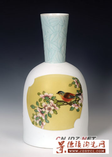 崔迪把傳統(tǒng)作為很好的資源,重新認(rèn)識和深度挖掘。這些作品主要以珍珠白釉為底釉,在瓷瓶頸部或邊緣刻上淺浮雕花紋,瓶身中間顯著部位以黃釉的開窗形式裝飾,開窗部分則以粉彩花鳥來表現(xiàn)。傳統(tǒng)陶瓷裝飾的開窗也叫“開光”,或稱“開斗方”。它是區(qū)別于傳統(tǒng)造型中的通景處理方式而得名的,主要在花鳥瓷畫中表現(xiàn)一種折枝小景的布局方式,使畫面顯得精致雅氣。
