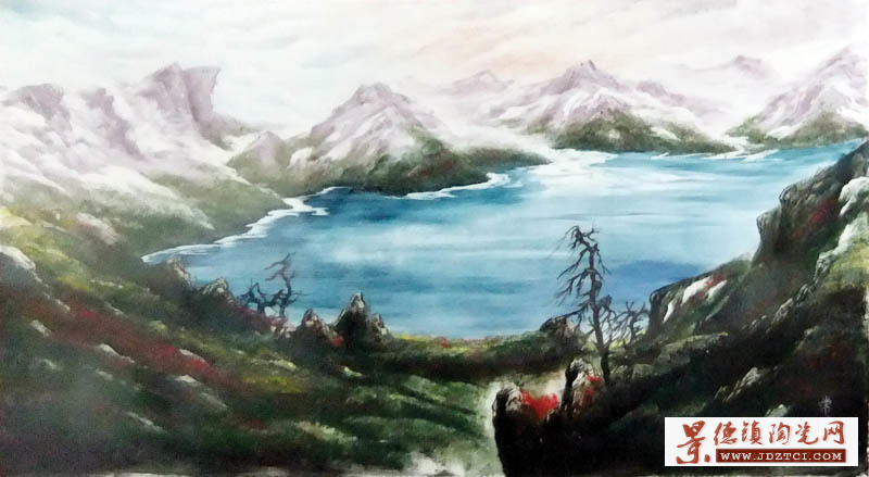 常炳華先生將西方油畫色彩在"油彩瓷畫"上的大膽運(yùn)用,給傳統(tǒng)的陶瓷繪畫藝術(shù)注入了一股清新之風(fēng)。在常炳華的"油彩瓷畫"中,色彩是其作品畫面的重要形成因素,他用釉色營造西方油畫當(dāng)中的強(qiáng)調(diào)的"光",他用"光"營造他的油彩瓷畫畫面的視覺中心, 由"光"產(chǎn)生影而顯出畫面的明暗、遠(yuǎn)近的空間透視。濃艷厚重的、高純度的暗黑、大紅、深綠、湛藍(lán)大面積地鋪墊,在灰白、淺藍(lán)、淡黃、純白等色調(diào)的襯托下,顯示出色彩驚心動魄的巨大力量;色彩塊面之間天衣無縫的銜接,遠(yuǎn)山近水、綠樹碧草的蕩氣回腸渲染,使得常炳華的"油彩瓷畫",既具有西方油畫的形式語言,更具中國傳統(tǒng)山水畫的意境;色彩在常炳華的油彩瓷畫里表現(xiàn)得如星光一樣燦爛輝煌。他毫不夸張地說是控制色彩對比與和諧的藝術(shù)大師。《長白山下》是常炳華先生油彩瓷畫系列里的其中一幅作品,遠(yuǎn)處淡藍(lán)的天空和皚皚雪山成為整個(gè)畫面悠遠(yuǎn)寧靜的背景,大面積的深綠形成了畫面的主調(diào),檸檬黃的小色塊分布其間,白色與深藍(lán)似河流曲折蜿蜒而下,夾雜著血一樣的紅色塊區(qū)域蔓延著侵蝕那純凈的藍(lán)色和幽綠色,廣袤的原野上矗立的冷杉是生命激情的體現(xiàn),令人產(chǎn)生無限意境的聯(lián)想。