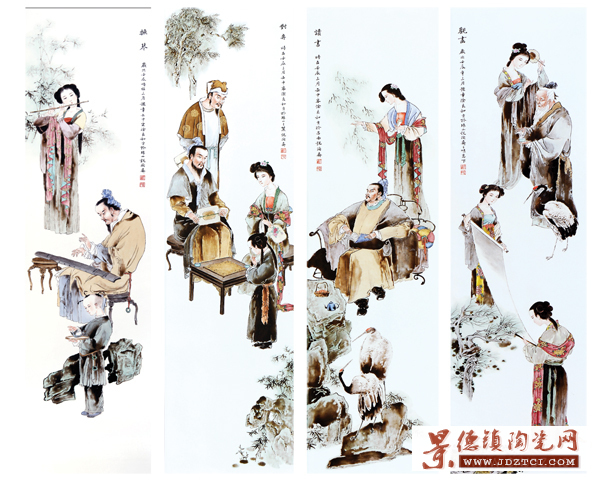 他的人物畫題材主要是以古典仕女、歷史故事、文人生活等內(nèi)容成為描繪的主題。他的粉彩作品《登高圖》,就是涂良如藝術(shù)心境最完美的詮釋。作品以氣勢(shì)雄渾的山水為背景,畫風(fēng)高古清奇,線條柔中帶剛。畫面中人物繁多,但不論遠(yuǎn)近高低,人物神態(tài)各異、面部表情生動(dòng)細(xì)致。整個(gè)畫面看似隨意而為,實(shí)則法度嚴(yán)謹(jǐn)。涂良如以富有意味的造型、筆墨、色彩、以及豐富的想象力,生動(dòng)地再現(xiàn)了古代歷史人物形象。正因?yàn)橥苛既缬幸环N不流于世俗的安靜心境,才可畫得出如此沉靜的美,以及那份悠然于世外的的曠達(dá),顯示出他精神上的高貴與誠(chéng)實(shí)。涂良如粉彩作品如《琴棋書畫》四條屏、《霓裳羽衣舞》瓷板也是他最具代表性的經(jīng)典之作。畫面背景雖然簡(jiǎn)略,但留給人廣闊的想象空間,畫中有畫極具縱深感。人物神情和心理的描寫細(xì)膩,畫面極具情節(jié)性,墨與色在無(wú)聲碰撞中,幻化出一幅幅逝去的古代人物靈動(dòng)的生活場(chǎng)景。