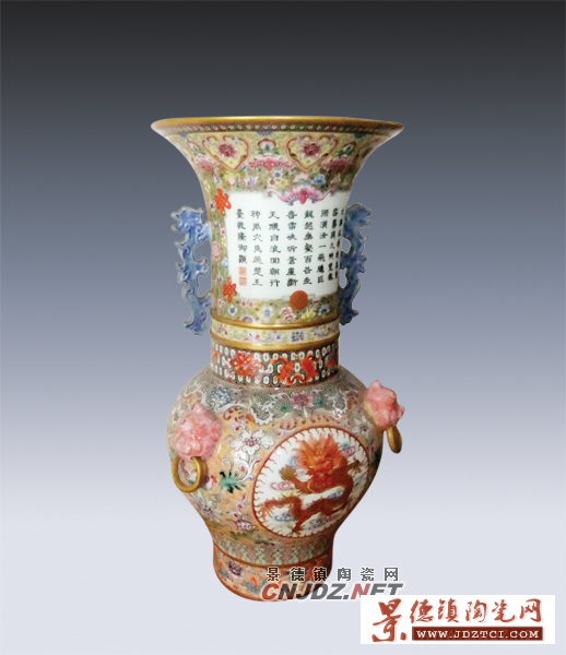 余勁松認(rèn)為:好的作品就是孤品、絕品,是不能復(fù)制的永久的經(jīng)典。此件《九五之尊》作品是150件吉祥圖案冬瓜瓶,它上面頸口用龜景重工結(jié)果裝飾,瓶頸有“福祿壽”三多圖案,寓意多子、多福、多壽。里面用傳統(tǒng)“萬字頸”鑲嵌而成。瓶肩采用五鳳穿萬花,由赤金描繪而成。瓶的主題就是“九龍”,九龍穿花,由西蕃洋蓮穿插,顯示出富麗堂皇、氣宇軒然的皇家氣派。底色之上由鳳尾草鑲嵌而成,也就是在顏色上面再次結(jié)果,這種重彩裝飾燒成風(fēng)險很大,但最終這件作品還是以其完美無瑕展現(xiàn)在世人面前。這是余勁松一輩子的心血之作,這件作品對他來說已經(jīng)不可復(fù)制。毫不夸張地說,這件作品從傳統(tǒng)文化著手,以中國傳統(tǒng)龍鳳圖案為設(shè)計(jì)亮點(diǎn),運(yùn)用現(xiàn)代陶瓷各種工藝表現(xiàn)手法,民族特色和原創(chuàng)成為這件作品真正的生命力和原動力,在傳統(tǒng)古典陶瓷藝術(shù)史上也屬于一件傳世之作、稀世珍品。