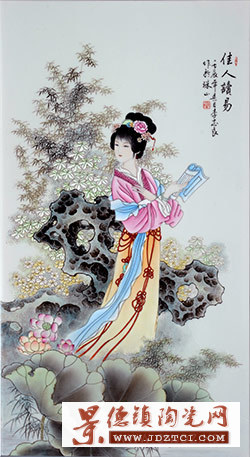 《佳人讀易》粉彩人物瓷板畫強(qiáng)調(diào)了人物神情,通過(guò)題款及人物服飾的處理等手法,使段與段之間有一種內(nèi)在的聯(lián)系,形成散而不亂、疏密得當(dāng)?shù)挠袡C(jī)整體。圖中人物神態(tài)宛然,所畫仕女端莊嫻靜,符合封建箴文內(nèi)容,畫中始終運(yùn)用了勻細(xì)而流動(dòng)的線條,顯示畫作的韻律之美,訴說(shuō)的人物仿佛有一種很愉悅的情緒在身體里游動(dòng),作品以文人畫風(fēng)為主導(dǎo),以不俗不套為原則,力求新意。