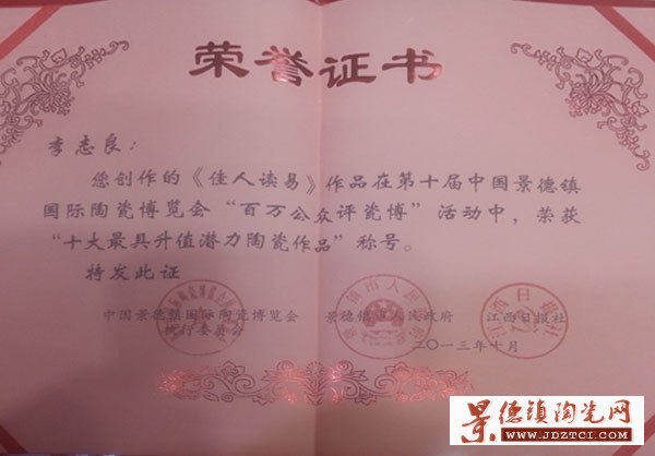 李志良創(chuàng)作的《佳人讀易》作品在第十屆中國(guó)景德鎮(zhèn)國(guó)際陶瓷博覽會(huì)“百萬(wàn)公眾評(píng)瓷博”活動(dòng)中,榮獲“十大最具升值潛力陶瓷作品”稱號(hào)