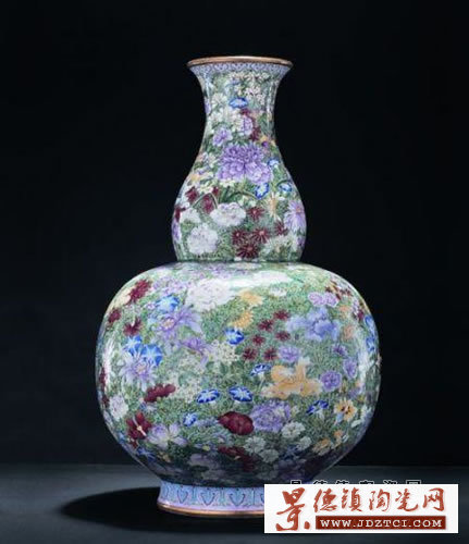圖1所示為清乾隆粉彩御制萬(wàn)花獻(xiàn)瑞大葫蘆瓶,高57.5厘米,體量恢弘,巧取瑞果葫蘆為形,曲線雋美。通體裝飾雍容華麗,百花爭(zhēng)妍,千姿百態(tài),姹紫嫣紅。所有花卉皆造型嚴(yán)謹(jǐn),意趣鮮活,運(yùn)筆俊逸而婉轉(zhuǎn)。花朵以重粉鋪填,層次豐富,明凈典雅;花葉大小、向背深淺不一,穿插合理。其設(shè)計(jì)獨(dú)具匠心,畫面雖繁密卻不亂,花葉分布各有主次,婉轉(zhuǎn)舒展,頗見(jiàn)柔美之姿。內(nèi)壁與底施松石綠釉,勻凈厚潤(rùn),中心書紅彩篆款“大清乾隆年制”,端莊規(guī)整,足際處涂抹金彩一周。全器上下皆工致非凡,處處彰顯出乾隆彩瓷無(wú)與倫比的華麗與尊貴。