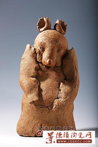 在充分挖掘泥條盤筑法之現(xiàn)代藝術(shù)表現(xiàn)力的同時,周國楨也對泥餅卷筒成型法進(jìn)行了探索,同樣取得了巨大成功。與泥條盤筑法一樣,泥餅卷筒法也是彩陶文化時期即已存在的一種非常古老的陶瓷成型技法,而且在中國陶瓷界一直都在沿用,如江蘇宜興制紫砂壺就多用泥餅卷筒法 。同樣,泥餅卷筒成型技法,不僅能使作品自然形成便于窯燒的中空結(jié)構(gòu),而且能夠有效發(fā)揮泥土的可塑性,還可以根據(jù)需要創(chuàng)作成各種肌理效果,其天然的泥味和殘缺美正是現(xiàn)代陶藝所追求的自由、奔放、隨意、大氣、返璞歸真的重要品格和造型語匯。周國楨泥餅卷筒法的代表作有《猶豬》(1989年)、《野豬》(1989年)、《任重道遠(yuǎn)》(1997年)、《森林怨》(1998年)、《吶喊》(1999年)、《大猴王》(1999年)、《靜觀》(2000年)、《老長工》(2000年)、《河馬》(2003年)、《羚羊》(2004年)、《指手畫腳》(2007年)、《有喜了》(2007年)、《喜來了》(2007年)等等。