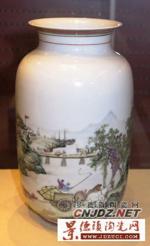 這件瓷瓶所繪“送公糧”圖,展現(xiàn)的正是那個(gè)時(shí)代農(nóng)民們趕送公糧的情景。作品繪于1955年元月,通景描繪了從四面八方紛紛趕來(lái)送公糧的農(nóng)民們,雖然載運(yùn)的形式多種多樣,有挑擔(dān)的,趕車(chē)的,船運(yùn)的,驢馱的……但大家都興高采烈,熱情高漲,積極踴躍。畫(huà)面既清新活潑,又富有情趣。瓷瓶腹部墨書(shū)題“一九五五年元月,熊曉峰作于美術(shù)合作社”。熊曉峰(1914~1996年),號(hào)醉翁、酒癡、竹影軒,江西南昌人。12歲拜師學(xué)習(xí)書(shū)畫(huà),后得益于傅抱石大師的指導(dǎo)和傳授。該作品風(fēng)格寫(xiě)實(shí),筆法細(xì)膩,色調(diào)淡雅,內(nèi)涵豐富,具有濃郁的生活氣息與鮮明的時(shí)代特色。