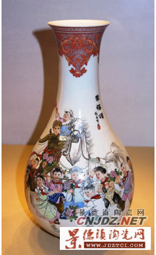 這件瓷瓶所繪“幸福頌”圖,描繪了12個身著少數(shù)民族服裝的小朋友,他們載歌載舞,簇擁著1名披著斗篷、拉著戰(zhàn)馬的志愿軍戰(zhàn)士,場面熱烈而壯觀。留白處題“幸福頌”三字,落“彭兆賢作”墨書款,鈐紅彩篆書章“印”字。作品上人物眾多,刻畫生動,色彩豐富,既充分展現(xiàn)了祖國少年兒童對志愿軍戰(zhàn)士的熱愛之情,也從一個側(cè)面反映了全國各族人民珍視幸福生活、熱愛世界和平的美好心愿。