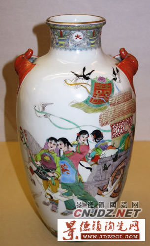 這件瓷瓶所繪“大躍進(jìn)萬歲”圖,以夸張的手法描繪了大豐收后人們拉著滿載瓜果、蔬菜和糧食的大馬車,快樂、幸福生活的場面。周圍環(huán)繞著叼“囍”字的喜鵲、銜彩綢的和平鴿、飛舞的蝴蝶以及盆栽萬年青等輔助紋飾,瓷瓶頸部圓形開光內(nèi)寫有“大”“躍”“進(jìn)”“萬”“歲”5個紅色大字,點(diǎn)名主題,留白處鈐紅彩方章“楊澍霖”三字。作品帶有鮮明的時代烙印,反映了“大躍進(jìn)”時代人們建設(shè)社會主義的高漲熱情。