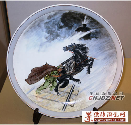 這件瓷盤(pán)所繪畫(huà)面,正是以烏云密布、風(fēng)雨交加、即將駛來(lái)的火車(chē)為背景,描繪了歐陽(yáng)海舍身攔驚馬這一驚險(xiǎn)場(chǎng)面。作品以灰黑色為主調(diào),襯托了主人公不怕?tīng)奚膲蚜抑e與舍己為人的偉大精神。