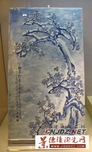 這件青花釉里紅瓷板畫是王步大師晚年力作。王步(1898~1968年),字仁元,號(hào)竹溪、陶青老人,江西豐城人。他運(yùn)用有別于傳統(tǒng)青花“雙鉤分水法”的“分水寫意法”,創(chuàng)造了青花瓷繪藝術(shù)的新高峰。他曾在文章中論述:先混水后勾線,畫者可以揮灑自如,不受限制,畫出來(lái)的畫活潑生動(dòng),線條也清爽。王步的成就一直受到有關(guān)部門的器重,先后被吸收為中國(guó)美術(shù)家協(xié)會(huì)會(huì)員、江西省美協(xié)理事、景德鎮(zhèn)市美協(xié)副主席、景德鎮(zhèn)市政協(xié)常務(wù)委員等,被譽(yù)為當(dāng)代“青花大王”。該作品運(yùn)用了中國(guó)畫的表現(xiàn)手法,以濃重青料繪老樹(shù)梅枝,虬曲蒼勁,變化多姿;以淺淡青料渲染漫天飛雪,層次豐富,意境深遠(yuǎn);以釉里紅繪梅花,豐姿綽約,紅艷欲滴。青花和釉里紅的燒制難度很大,如此青、紅發(fā)色均艷麗完美者十分難得。留白處題寫草書款:“梅花歡喜漫天雪,凍死蒼蠅未足奇。一九六四年陶青老人竹溪王步寫意”,畫青花“竹溪”“王步”二方章。