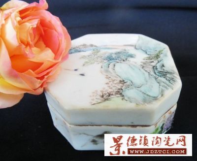 印盒因?qū)傥姆科,所以制作一般都很精良,適合把玩觀瞻,深受文人及藏家追捧。近幾年市場行情也是一路上揚。筆者酷愛小巧文氣的印盒,珍藏有一些晚清粉彩、青花、名人淺絳彩和顏色釉印盒,其中最為筆者喜歡的是一件“清光緒高心田淺絳六方印盒”,此印盒可謂于方寸之間呈萬千氣象,畫面構(gòu)圖疏密得當,山水花鳥交輝,畫工細膩傳神。畫面近處山巒突兀、廟宇掩映、一葉扁舟、水波浩渺;遠處樹木蔥蘢、層林盡染;側(cè)面則鳥語花香、生機盎然,當是胎釉彩中精良的觀賞雅器。