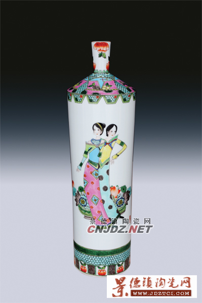 陳也君:景德鎮(zhèn)是陶瓷藝術之都,陶瓷藝術人才輩出,如何從中脫穎而出?天性與理性讓張萬蓮的藝術之路走得不同尋常。她選擇了并不好駕馭的,古彩。相對于其他陶瓷裝飾門類,古彩的局限性比較大,表現(xiàn)手段是點、線、面,所有表現(xiàn)主題都離不開這些,其色彩也很單純,但很強烈和鮮明。張萬蓮的古彩題材廣闊,不僅擅于花鳥,更拓展到人物,不管是傳統(tǒng)特色濃郁的京劇人物,時代特征明顯的民國女性,她都表現(xiàn)得栩栩如生,如張萬蓮的《模特秀》,瓶體造型是一件旗袍,旗袍的領子上飾以青花,主體畫面上是4個現(xiàn)代亮麗的美眉身穿各種旗袍,形態(tài)婀娜,美眉身旁配以吉祥物鳳凰……同樣的是古彩瓷,這種古典美融入了時尚元素的大膽創(chuàng)新,讓這套《模特秀》散發(fā)出一種無法抗拒的美。這套作品人讓人看到了張萬蓮藝術創(chuàng)作超然自由的精神內涵。這套《模特秀》其實是張萬蓮從一本名叫《現(xiàn)代旗袍》的書上得來的靈感。當她看到一件件形態(tài)各異的旗袍,突然靈感迸發(fā),并在此基礎上進行了大膽的創(chuàng)新。她從藝術的角度進行了一定程度的藝術夸張,旗袍與人物也介于似與不似之間,用這種模糊的語言給人一種無窮的再創(chuàng)作空間。
