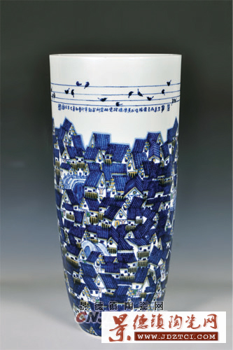 傅國勝對青花瓷畫情有獨鐘,青花顏色雖然單純的,但傅國勝筆下的青花枝繁葉茂一點也不單調。因為傅國勝對工藝的嫻熟、對青花色料的自然掌控,所創(chuàng)作品顯示出色面濃淡相宜、色調冷暖和諧、色階自然過度,作品重點突出瓷質的白色和釉料的青色,運用斗彩、顏色釉、半刀泥等裝飾,相互間形成鮮明的對比。例如他的作品青花釉里紅瓷瓶《春風得意》、《荷塘清趣》、青花刻花瓷瓶《碩果》等,這些作品色彩的強烈對比,使得畫面中的花草蟲魚顯得特別活躍,仿佛有如真實的自然界顯示出生命的活色生香來。