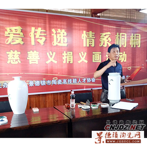 據(jù)悉,參加筆會(huì)的20幾位陶瓷藝術(shù)家是因?yàn)殛P(guān)注了桐桐最近一個(gè)月的來(lái)的報(bào)道,了解了桐桐的病情,不忍桐桐幼小而可愛(ài)的生命受到疾病的威脅,也為桐桐母親愛(ài)子心切四處奔波的精神所打動(dòng),因此景德鎮(zhèn)市陶瓷高技能人才協(xié)會(huì)決定舉此次慈善活動(dòng),為桐桐的健康成長(zhǎng)爭(zhēng)取機(jī)會(huì)。協(xié)會(huì)會(huì)長(zhǎng)李澤靖表示,這次義捐義畫(huà)活動(dòng),一是傳遞愛(ài)心,幫助需要幫助的人,二是呼吁廣大藝術(shù)家與愛(ài)心人士,共同關(guān)注公益活動(dòng)。活動(dòng)現(xiàn)場(chǎng),李會(huì)長(zhǎng)現(xiàn)場(chǎng)創(chuàng)作了一副名為“童趣”的作品,希望桐桐如同作品中的兒童一樣,健康快樂(lè),充滿童趣。