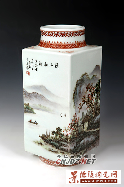 縱觀幾代“汪派山水”,不難發(fā)現(xiàn)“汪派山水”繼承了中國(guó)傳統(tǒng)文人畫中的品位。講究融詩(shī)、書、畫于一體,由作者本人書畫并題。作品意境深遠(yuǎn),色彩淡雅,以景傳情,具有強(qiáng)烈的感染力。因此能表現(xiàn)作者主觀思想志趣與審美觀念,突出個(gè)人的創(chuàng)作風(fēng)格與個(gè)性。也能體現(xiàn)作者的文化藝術(shù)修養(yǎng)和哲學(xué)思想。山水創(chuàng)作將國(guó)畫的皴、擦、暈、染等技法融入瓷畫創(chuàng)作,通過陶瓷這個(gè)載體表現(xiàn)個(gè)人思想情感和審美旨趣,這完全有別于傳統(tǒng)山水的勾線填色和富麗重彩,而顯得清雅脫俗,個(gè)性風(fēng)格突出,使作品有很高的文化內(nèi)涵和藝術(shù)價(jià)值,這是以往景德鎮(zhèn)的傳統(tǒng)彩繪藝人所不具有的。在造型藝術(shù)方面,適應(yīng)陶瓷花瓶等圓形器皿彎曲轉(zhuǎn)折的特點(diǎn),巧妙布局,別具匠心地始創(chuàng)難度很高的通景山水,使陶瓷作品在各個(gè)角度看都是完整的畫面,又可以連續(xù)轉(zhuǎn)動(dòng)觀賞,將國(guó)畫山水長(zhǎng)卷的神韻融入其中,而陶瓷造型特色,又使之具有首尾相連,循環(huán)往復(fù)的動(dòng)態(tài)美。在設(shè)色方面,既不同于古彩的單調(diào)、刻板、艷俗,又比淺絳彩豐富,富于表現(xiàn)力。