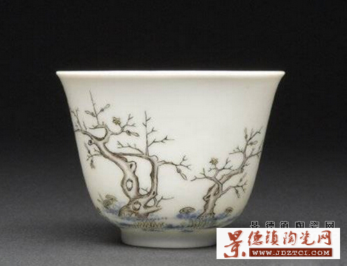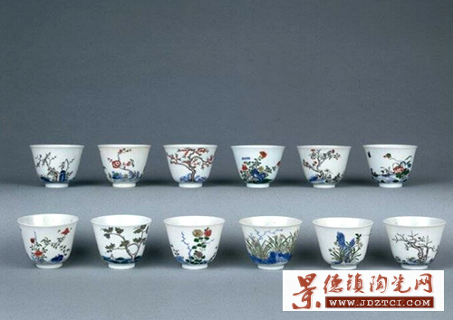 “十二月花卉紋杯”12件為一套,其外形特點(diǎn)為:撇口、深腹、淺圈足、胎體輕薄、器型精巧絕倫,造型規(guī)整優(yōu)美,胎質(zhì)乳白、器薄如紙、晶瑩剔透;其外壁分別用一年十二個(gè)月中不同的花卉來(lái)裝飾,并配以相應(yīng)的詩(shī)句?滴跏ɑ鼙系幕ɑ芤运苫ㄩ_始,然后以此為迎春花、桃花、牡丹花、石榴花、荷花、蘭花、桂花、菊花、芙蓉花、月季花和梅花,一杯一花,腹壁一面繪畫,另一面題詩(shī),詩(shī)句出自唐詩(shī)。每只杯上繪一種應(yīng)時(shí)花卉,指代歷史上的著名女性,并題上相應(yīng)的詩(shī)句,慣稱“十二月花神杯”。規(guī)格:口徑6.7厘米,足徑2.8厘米,高4.9厘米。