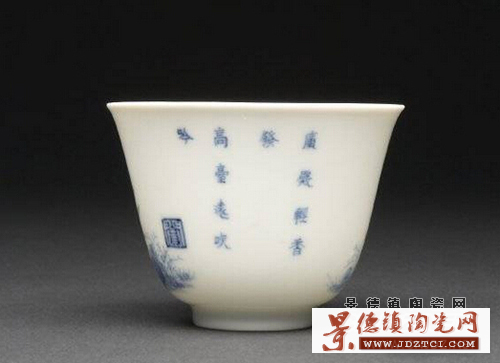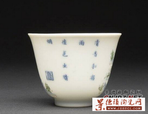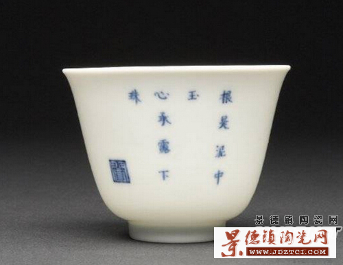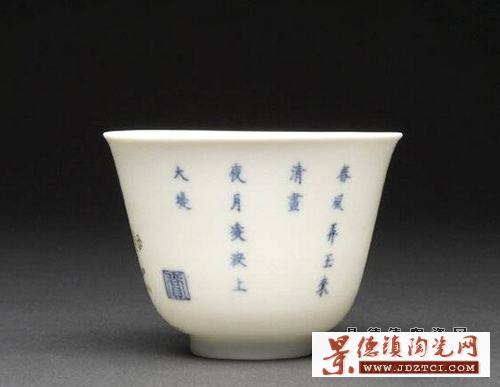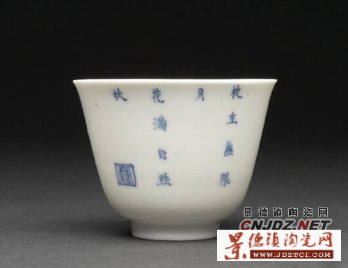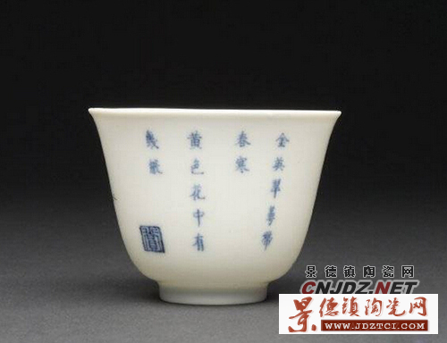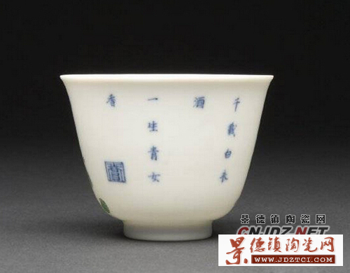 康熙對(duì)歷代的瓷器很有研究十分欣賞,康熙十九年下令景德鎮(zhèn)恢復(fù)御窯廠,研制新風(fēng)格的各種瓷器。康熙二十五年景德鎮(zhèn)御窯廠為宮廷燒制一套生活用瓷——“十二花卉紋杯”,第一次把“詩(shī)、書、畫、印”在同一器皿上并用,每只杯上繪一種應(yīng)時(shí)花卉,指代歷史上的著名女性,并題上相應(yīng)的詩(shī)句,慣稱“十二月花神杯”?滴趸实凼窒矏郏瑤状文涎捕紟г谏磉,他不僅喜歡花神杯瓷器的工藝更喜歡花卉配唐詩(shī)的文化意境。