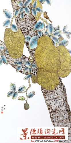 清麗近年之陶瓷畫,多為熱帶雨林景象。行走于版納叢林之中,她思考著寫生的意義,尋找有限之形以外的東西,用心去感受去創(chuàng)造自然界最真實(shí)的自然之美。對于工筆花鳥而言,寫實(shí)的功底固然非常重要,然而傳達(dá)形象之外的精神氣質(zhì),表達(dá)內(nèi)心與宇宙同一的律動,是清麗的藝術(shù)追求。滿眼繁華景象,然而也許終是幻影,于是般般放下,如同畫面的定格,如同音樂的流轉(zhuǎn)。因此,觀她的陶瓷繪畫,雖然是工筆,卻頗有寫意的輕松。鄒小山云“以萬物為師,以生機(jī)為運(yùn),見一花一萼,諦視而熟察之,以得其所以然,則韻致風(fēng)采,自然生動,而造物在我矣”!霸煳镌谖摇币粍t摻雜畫家對生活的真實(shí)感悟,一則在于對畫面、媒介的個性把握,形成她獨(dú)到的觀察和表達(dá)世界的方式。