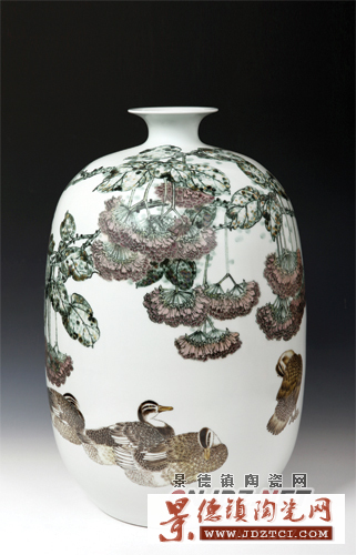 談及陶瓷創(chuàng)作,清麗直言不得不面臨一個問題:畫畫得很好,但陶瓷卻不一定畫得好。工筆繪畫運(yùn)用在陶瓷材料之上,首先對于陶瓷媒介的掌握需要時間的摸索與積累,尤其是陶瓷花瓶的構(gòu)圖跟國畫宣紙的構(gòu)圖也是兩種不同的思維理念,得花心思去研究才行。尤其粉彩,從打料勾線到點(diǎn)染填色,工藝非常之繁復(fù)需要大量的實(shí)踐摸索。清麗的陶瓷作品中,可見她的匠心獨(dú)運(yùn),能看得出她對于筆底形象如何適應(yīng)陶瓷媒介的思索,尤其是在結(jié)合瓷器的器形,表現(xiàn)層次疏密的關(guān)系。青花斗彩《雨林之歌》,瓶肩部的物象的飽滿與瓶身下方留白的對比,打破橢圓型器形的凝重刻板,而顯得輕松明快!洞髽洳ぬ}》瓶頸的素潔與瓶身的繁密,滿而不塞,繁而不堵,形成典雅端莊又獨(dú)具個性的巧趣。在陶瓷媒介表現(xiàn)探索里兜兜轉(zhuǎn)轉(zhuǎn)之后, 清麗越來越自信找到自己的目標(biāo)和方向了,從她的畫面內(nèi)容中可以讀出她對于陶瓷繪畫表達(dá)已頗有心得。