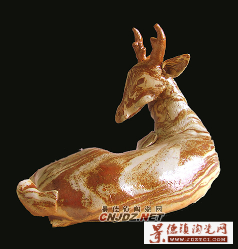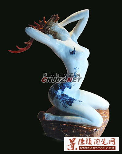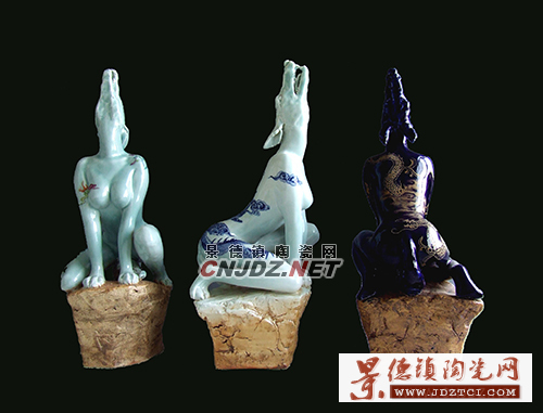 這種人神合一的形象給了趙坤巨大的震撼,她開(kāi)始嘗試用簡(jiǎn)練的雕塑語(yǔ)言表現(xiàn)這個(gè)動(dòng)人的意象,雕塑的主體是少女美麗的裸體,而少女的頭則用各種動(dòng)物的頭直接裝飾:美麗的鹿角、雄性的豹頭、閃著寒光的狼首。在裝飾手法上,趙坤也開(kāi)始向傳統(tǒng)學(xué)習(xí),大量運(yùn)用了景德鎮(zhèn)原素,青花、粉彩繪出的圖案美侖美奐,表現(xiàn)出一種極具張力的美感。
