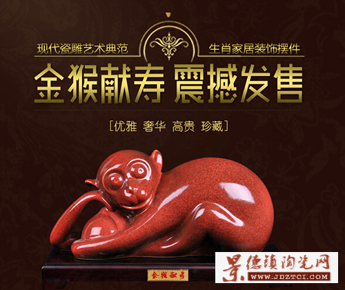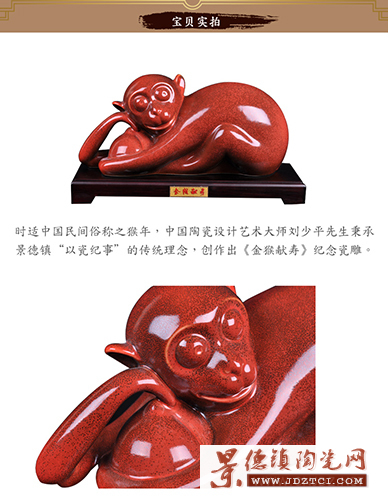 時(shí)適中國(guó)民間俗稱之猴年,中國(guó)陶瓷設(shè)計(jì)藝術(shù)大師劉少平先生秉承景德鎮(zhèn)“以瓷紀(jì)事”的傳統(tǒng)理念,創(chuàng)作出《金猴獻(xiàn)壽》生肖紀(jì)念瓷雕。由景德鎮(zhèn)市昌南窯瓷業(yè)有限公司出品,江西省陶瓷研究所監(jiān)制。