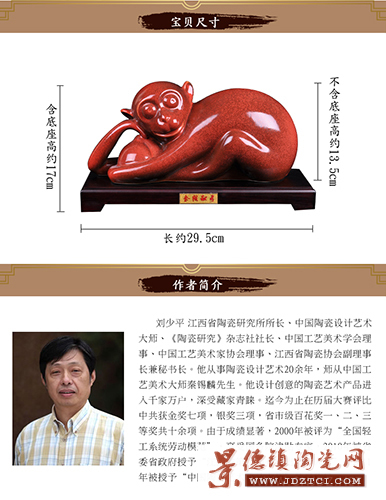 中國(guó)陶瓷設(shè)計(jì)藝術(shù)大師劉少平先生用率真的手法,于一只靈猴手里懷抱鮮艷無(wú)比、碩大水靈、香氣馥郁的蟠桃,形象動(dòng)作極富童真,意思更有趣味——“壽且貴”。其鮮活的形象,吉祥的寓意及極具個(gè)性的藝術(shù)詞匯,在全國(guó)的陶藝界、文玩收藏界及各大媒體界均引起強(qiáng)烈的反響。