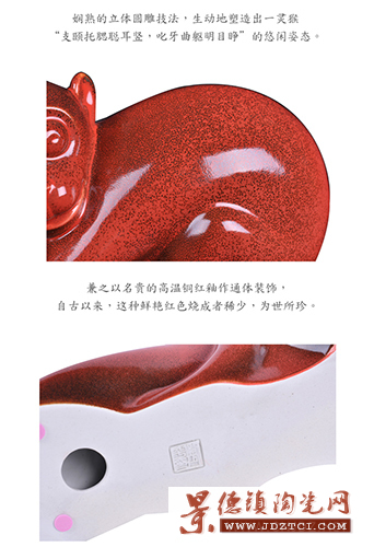 “古面睢盱露瘦月,鷸毛勻賦舒玄云”。猴,自古以來(lái)就屬中國(guó)造型藝術(shù)題材中的“四靈”、“八瑞”之一。劉大師以嫻熟的立體圓雕技法,生動(dòng)地塑造出一靈猴“支頤托腮聰耳豎,叱牙曲軀明目睜”的悠閑姿態(tài),無(wú)不透露出其天生活潑、孩童般頑劣。稚趣和機(jī)警的野性和特質(zhì),賦予了美猴深邃的文化底蘊(yùn)和現(xiàn)代瓷雕藝術(shù)的審美典范、兼之以名貴的高溫銅紅釉作通體裝飾,更深化了歡愉喜慶的動(dòng)感和樂(lè)韻,以全新的造型語(yǔ)言和色彩語(yǔ)言表達(dá)了“新春納福、金猴獻(xiàn)壽”的良好夙愿。