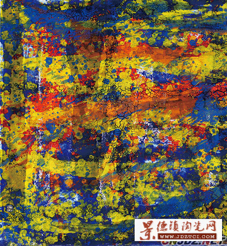 朱振洪老師在藝術(shù)創(chuàng)作中主張“法自然,求本真”,在作品中再現(xiàn)的是嬰兒出生時本真的自由世界。我一直想去詮釋我對于這句話的理解,這樣一個自由的世界應(yīng)該是一種什么樣的狀態(tài)呢?在看他的《心境》系列作品,似乎找到了一些線索。類似一種混沌的,尚未建立清晰秩序的世界中,實際上囊括了自然、人生、宇宙的萬象,正是這種混沌的表象里,見不到章法、約束,才意外地使人的意識進(jìn)入一種自由的時空,仿佛回復(fù)到人乃至世界誕生的初始狀態(tài)。在被朱振洪用顏色釉顛覆與模糊的秩序里,我們開始跳脫現(xiàn)實生活中的韁繩,進(jìn)入一個任意想象的空間,每一個觀者在他建構(gòu)的情境中都成為一個絕對自主的個體,思緒開始馳騁、奔跑,向縱深的無極限的世界中走去。朱振洪的《心境》系列作品更像是一場恢弘的夢境,這個夢境將現(xiàn)實虛化,折射出的是一個幻象的世界,而人作為有意識的群體,在幻象面前依然憑借著清醒的意識去作出屬于自己獨有的那份解讀。因而《心鏡》系列作品在藝術(shù)上實際上是憑借抽象的符號來讓人主動地揭示人對于時空、宇宙或者自然內(nèi)在的觀照,反而是極為清醒、深刻的。