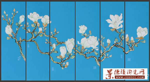 高貴、潔白、芬芳、清秀,在深沉蒼茫的藍(lán)色時(shí)空中,當(dāng)春寒的料峭還在彌散著瑟瑟的感覺(jué),卻有一種如白玉般純潔的花朵正悄悄地綻放枝頭,體干枯皴,聚滿歲月滄桑,虬枝挺勁,似迎風(fēng)斗寒之錚錚鐵骨。而在鐵枝老干間,竟煥發(fā)出一片蓬勃生機(jī),在異常堅(jiān)實(shí)古樸的金色花托上,玉蘭花朵如純潔無(wú)瑕之仙姿屹立,明麗耀空,奪皎月之魂魄、凝冰雪之精髓,塵世喧囂為之而息,百紫千紅見(jiàn)之遜讓。這便是實(shí)力派陶瓷藝術(shù)家周?chē)?guó)生創(chuàng)作的工筆粉彩《夢(mèng)》系列所展現(xiàn)出來(lái)的如夢(mèng)如幻的迷人意境。