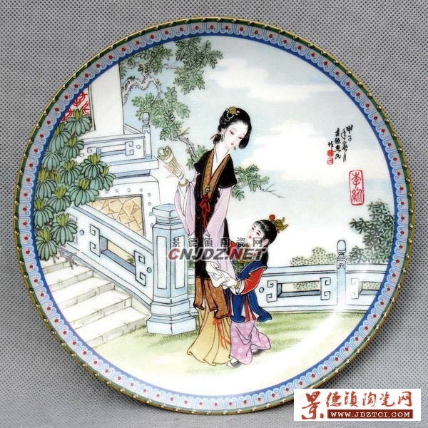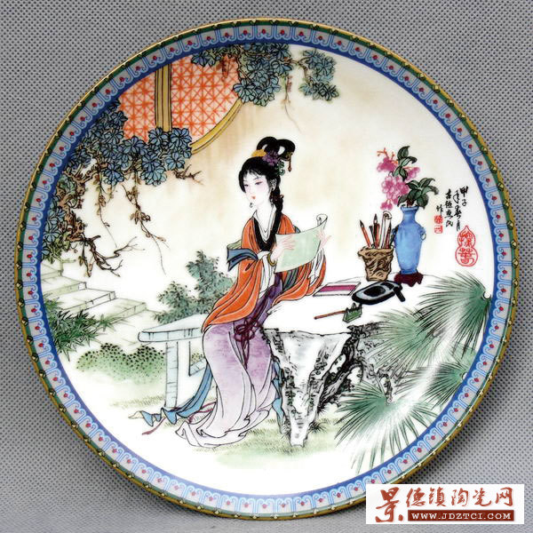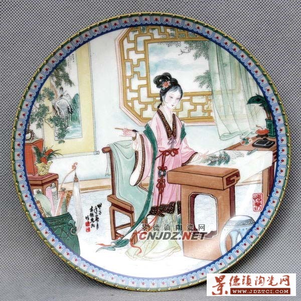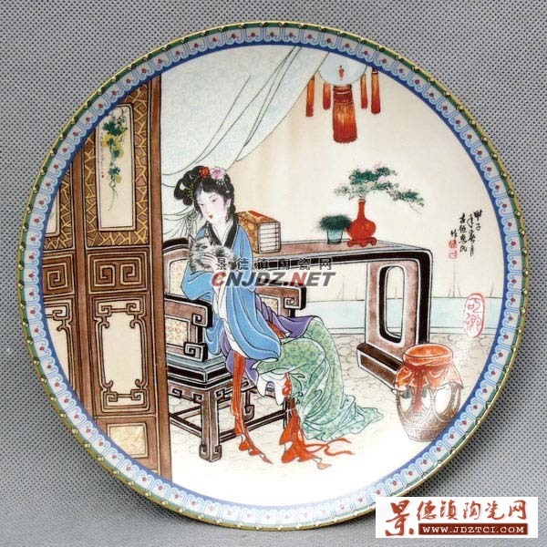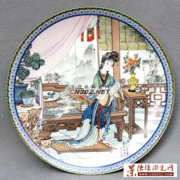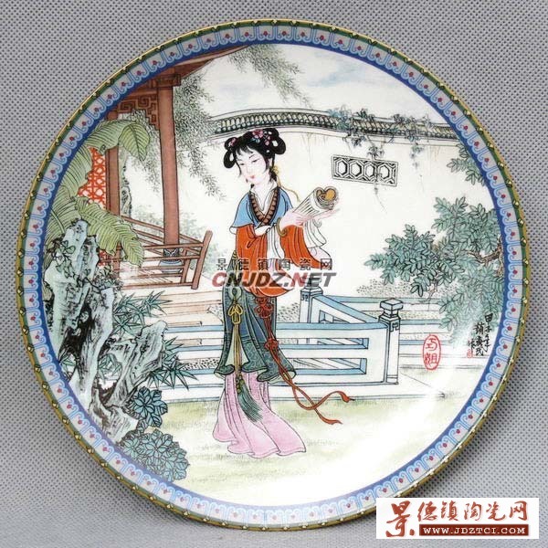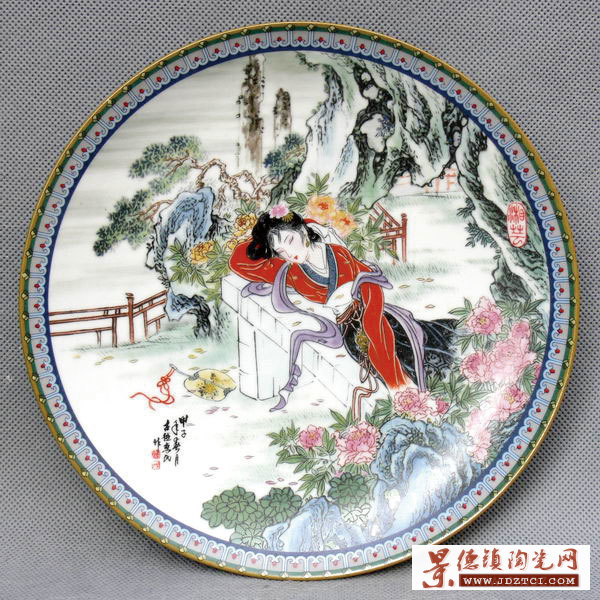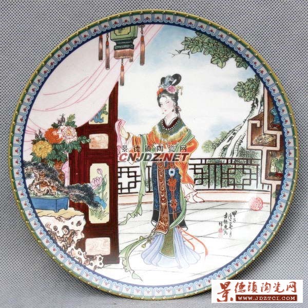 趙惠民根據(jù)古典文學(xué)名著《紅樓夢》設(shè)計創(chuàng)作的十二釵系列彩盤,個個性格鮮明,呼之欲出,十二個人物或立或坐、或讀書、或賞花。