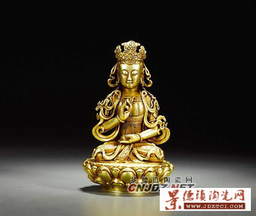 明;H:17cm;說明:觀世音菩薩是西方極樂世界阿彌陀佛座前的上首菩薩,又譯為觀自在普渡眾生大慈大悲菩薩,在藏傳佛教中稱雪域高原 是觀世音菩薩的教化之地,稱觀世音為雪域的救主。此尊造像胸垂瓔珞,繡帶輕飄,結(jié)跏趺坐于蓮座之上。整尊造像由純金打 造,造型端莊,各部分比例和諧,線條流暢,觀音雙耳微垂,神態(tài)祥和。明清時期的純金佛造像,均為宮中擁有,民間不允許制 造,因此這尊純金制造的佛像,乃宮廷造辦處制作,保留至今實屬難得。