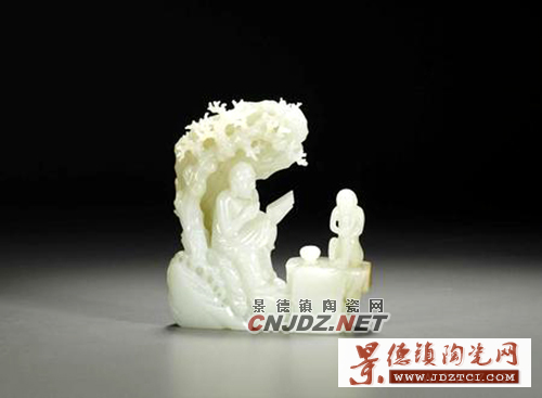 清乾;H:12.6cm;說 明:“古香”、“太璞”篆書雙款參考:1.《欽定秘殿珠林 續(xù)編》,(清)王杰等輯,上海古籍出版社,1995年,132頁。 2.《清高宗御制詩文全集》之《御制清高宗御制詩初集》,二九 卷。3.《故宮書畫錄(卷八)》,國立故宮博物院,1956年,第四 冊,73頁;第五冊,333-334頁。說明:白玉山子,隨形而雕,玉 質(zhì)上乘,溫潤滋澤,山峰聳立,壁崖料峭,山峰巖壁處的局部分布 有黃褐色玉皮,燦如黃粟,艷如朝陽。治玉者隨料之勢雕琢仙山美 景,其運刀如筆,依據(jù)皴法,表達山勢險峻,層巒疊嶂,完全將奇 山仙洞之深淺層次表達無遺,極具圓雕立體感。山間菩提樹下,仙洞之中,第十六羅漢--阿必達尊者靠壁而依,一手持卷,一手垂 于膝上,靜坐入定。細細觀之,羅漢精神矍鑠,雙眉微挑,雙耳垂 肩,面容安詳,禪意深遠,其身形精瘦,上身赤裸,筋骨嶙峋,臂 上衣帶圍裹,隨意而安之情盡顯。山子背面打磨光潔,上有帝王題 寫之偈語:「御制羅漢贊,第十六阿必達尊者,梵帙閱畢,焚香熏 之,是何佛法,不可議思。生住異滅,萬法歸一,胡不視此傳神之 筆!怪骡j刻一陰一陽兩款方印「古香」、「太璞」。此器受清 代院體畫的影像,完全是將畫之形象,以立體三維的方式表達在上 等白玉之上,畫面琢磨細膩,注重層次,可謂清代宮廷玉雕山子之 精品,更是近年來海外回流之上上等佳品。古代采玉全靠人工,和 田好玉之獲得,靠緣分運勢為主,難度之大,猶如登天。此件作品 所用玉料應(yīng)為新疆葉爾羌所產(chǎn),材料碩大,珍貴異常,因而在作品 的藝術(shù)構(gòu)思上,充分利用原料形狀的特點雕刻,其造型隨玉料之 形,自然意趣,圓雕羅漢手捧佛經(jīng),神態(tài)虔誠,極為生動,反映了 清代乾隆時期制玉水平之妙到顛豪,不惜工本,極為震撼。故宮博物院藏有多尊類似玉雕羅漢山子可供參考。