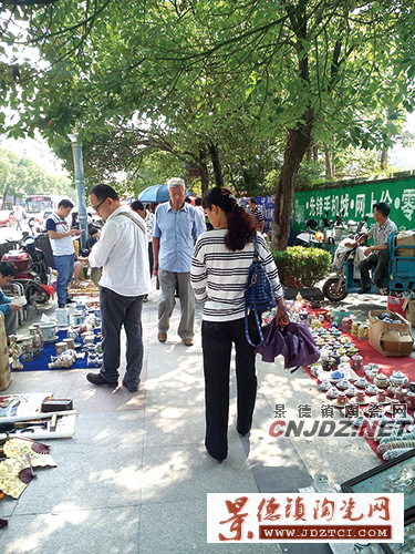 每逢周末,位于景德鎮(zhèn)東市區(qū)的雕塑瓷廠就迎來盛大節(jié)日。不僅在廠里,大門口人行道上都擺滿了攤位,這些擺攤的攤主,有年輕的女孩,中年的大叔,還有年邁的老爺爺。攤位上雜陳著茶具、擺件、香插、掛件、首飾、大件花瓶、碎瓷片等,幾乎你能想到的陶瓷制品,都能看到。