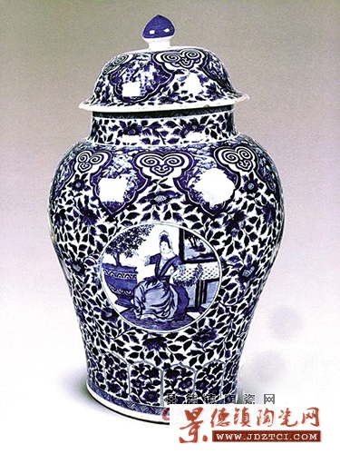清康熙 青花法國婦女形象開光裝飾蓋罐