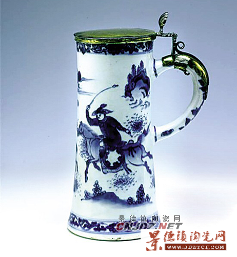 這件明末的杯子是按照西方客戶的要求定制的,是歐洲常見啤酒杯的造型。杯子以青花裝飾,內(nèi)容為獵鹿圖,一手持皮鞭的騎馬男子正在追趕著一頭鹿,鹿慌不擇路地向前逃竄,畫面充滿著動(dòng)感。在歐洲造型的器物上,以中國(guó)的繪畫技法表現(xiàn)的中國(guó)傳統(tǒng)題材內(nèi)容,在17世紀(jì)較為流行,對(duì)于西方市場(chǎng)來(lái)說(shuō),異域風(fēng)格的內(nèi)容,更吸引人。杯子有銀質(zhì)蓋,這是在歐洲銷售以后,客戶按照自己的審美要求,由歐洲銀匠制作的。(以上藏品皆為上海博物館藏)