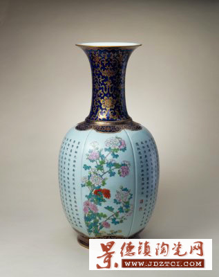 霽藍地描金粉彩詩句花卉紋大瓶,清乾隆,現(xiàn)藏于北京故宮博物院霽藍地描金粉彩詩句花卉紋大瓶,清乾隆,現(xiàn)藏于北京故宮博物院