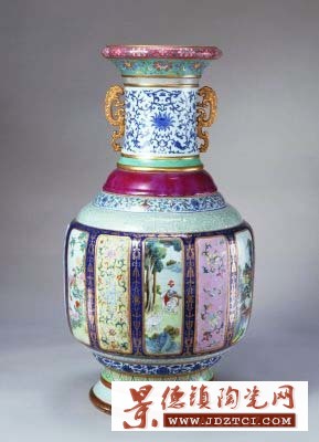 各種釉彩大瓶,洗口,長頸,長圓腹,圈足外撇。頸兩側(cè)各置一螭耳。器身自上而下裝飾的釉、彩達15層之多。所使用的釉上彩裝飾品種有金彩、琺瑯彩、粉彩等;釉下彩裝飾品種有青花;還有釉上彩與釉下彩相結(jié)合的斗彩。所使用的釉有仿哥釉、松石綠釉、窯變釉、粉青釉、霽藍釉、仿汝釉、仿官釉、醬釉等。主題紋飾在瓶的腹部,為霽藍釉描金開光粉彩吉祥圖案。