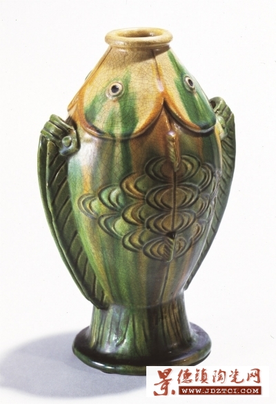 南京博物院收藏的唐·三彩陶雙魚瓶,出土于揚(yáng)州掃垢山,瓶高23厘米、口徑4.5厘米、底徑8厘米。瓶體似圓柱形,魚口、目、鱗、脊一應(yīng)俱全。魚眼球凸出呈黑色,二魚中間各有上下二個(gè)小翅,形象逼真,栩栩如生。色分綠、黃、褐三色,互相浸潤、交融,形成斑駁燦爛的彩色釉。雙脊間有穿系小孔,便于系繩,既實(shí)用又美觀,反映了晚唐制瓷工匠在設(shè)計(jì)上的高度造詣。