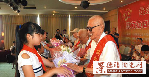 近日,由中國(guó)陶瓷藝術(shù)文化發(fā)展中心、江西省工藝美術(shù)學(xué)會(huì)和市老干部局聯(lián)合主辦,珠山書畫院承辦的紀(jì)念中國(guó)人民抗日戰(zhàn)爭(zhēng)勝利七十周年、慰問抗日老戰(zhàn)士?jī)x式暨“瓷都珠山杯”全國(guó)陶瓷和書畫藝術(shù)作品賽聯(lián)展在我市舉行。當(dāng)天上午,抗日老戰(zhàn)士張新城、王長(zhǎng)治、張克宇出席活動(dòng),就座在主席臺(tái)前排,少先隊(duì)員向他們獻(xiàn)上了鮮花,主辦方贈(zèng)送了“紀(jì)念中國(guó)人民抗日戰(zhàn)爭(zhēng)勝利七十周年”瓷盤。