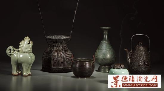 悠然自得•茶器花器香器專場(chǎng)為新增拍場(chǎng),拍品50余件。包含瓷器、紫砂、竹器、木器、銅器等材質(zhì)。茶器中清•紫砂小茶壺一對(duì)小巧精致,估價(jià)在0.3萬(wàn)-0.5萬(wàn)元。花器中竹編花器為首次推出,均為二十世紀(jì)制作,兼具實(shí)用與觀賞價(jià)值,估價(jià)均在人民幣0.5萬(wàn)元以內(nèi);清•粉彩荷葉紋花盆成套出現(xiàn),估價(jià)在2.5萬(wàn)-3萬(wàn)元。香器中香爐、香薰眾多,以元、明時(shí)期浙江龍泉窯為主。