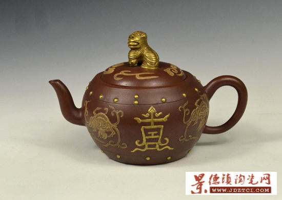 清 紫砂描金壽字龍紋獅鈕壺 長 18.8cm 高 11.8cm
