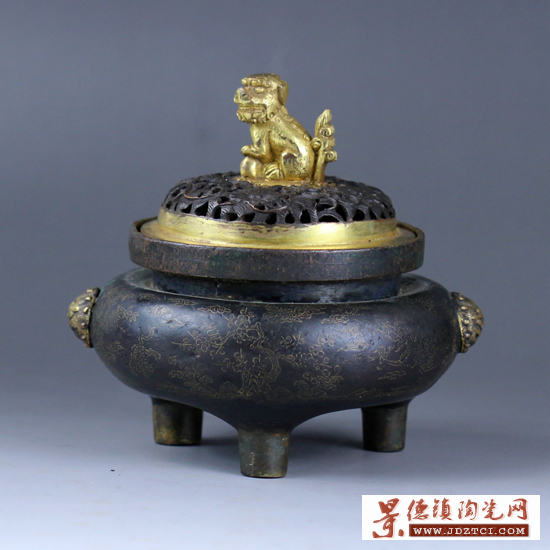 此銅爐鎏金雙獅耳,鼓腹撇口,銅滿雕鎏金獅鈕蓋,周身嵌金絲,描繪梅花圖案,三直足,工藝精湛細(xì)膩,為清代造辦處鑄造,十分難得。