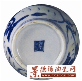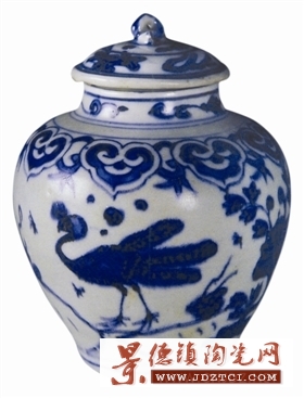 罐通高14.1厘米,口徑5.2厘米,足徑6.1厘米;呈瘦長形,蓋鈕為一蛇形雕塑體,造型秀美。底署青花單框吉語款。肩部如意紋之間,飾有環(huán)狀連接物及三枚小葉。這類裝飾,在正德時(shí)是沒有的,為嘉靖時(shí)期的紋飾特征。青花呈色濃艷微紫,系采用上好回青中加石子青的混合料。