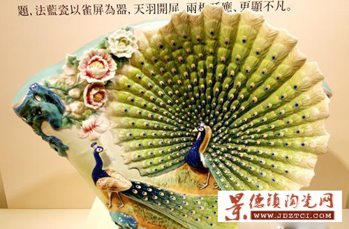 此件瓷品的雕模師蕭宇君、彩繪師林培懿也出席記者會(huì)。據(jù)介紹,這件瓷品從造型上,以扇形呼應(yīng)畫(huà)作中孔雀開(kāi)屏的雄偉大氣。雕塑時(shí),必須細(xì)致處理孔雀羽毛的紋路和層次,是對(duì)雕模師的一大挑戰(zhàn)。此外,瓷品孔雀羽毛上的紋路,也都是彩繪師一筆一畫(huà)手繪而成,展現(xiàn)工藝細(xì)膩。
