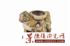 筆者早先就注意到館藏的這件武士牽獅俑,看其形制似乎是一個器座,但一直不很清楚它的具體用途。上個月在北京參加全國博物館專業(yè)人員陶瓷鑒定培訓班,偶然聽到北京大學秦大樹教授授課中提到一件同類的金代紅綠彩塑像。培訓回來后,筆者立刻查找相關資料,并很快在1997年第10期的《文物》期刊上找到秦大樹先生《邯鄲市峰峰礦區(qū)出土的兩批紅綠彩瓷器》一文。文中介紹1972年峰峰礦區(qū)發(fā)現的一處窖藏,出土了一批紅綠彩佛像,其中一件菩薩騎獅塑像高46.2厘米,獅子高20.5厘米、長22.5厘米,獅子側面亦塑有一牽獅武士,造型、尺寸及風格幾乎與安徽博物院收藏的這件武士牽獅俑完全相同。于是,筆者豁然明了,獅背上圓形器上方原來應有一尊菩薩塑像,獅子是這位菩薩的坐騎。