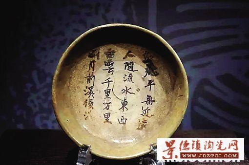 碟高4.2厘米,口徑14.7厘米,底徑5厘米,1978年長沙窯廖家坡遺址出土,現(xiàn)收藏于長沙市博物館。器物圓唇,敞口,折腹,圈足。碟心無釉, 以褐彩在碟心書寫:“鳥飛平無近遠,人隨流水東西。白云千里萬里,明月前溪后溪!边@是唐代詩人劉長卿題為《苕溪梁耿別后見寄》詩中八句的其中四句,全詩通過描寫飛鳥、流水、白云、明月等景物,以“遠近”“東西”“千萬”“前后”等對仗表露出作者遠離鄉(xiāng)土、懷才不遇的惆悵之情。