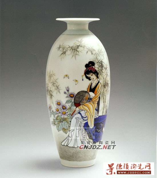 一件好的藝術(shù)瓷作品,要有三個(gè)標(biāo)準(zhǔn),一是器型要漂亮,適合畫境的表現(xiàn)需要,如畫單個(gè)仕女侍立修竹下,瓶型就應(yīng)該是以瘦長的梅瓶或橄欖瓶為宜;二是釉色白膩,以青白釉最好;三是裝飾上要有自己的思維,包括造型形式、構(gòu)圖章法、色彩語言等等,都要有個(gè)性。三者統(tǒng)一,就有民族的文化、地域的特色、個(gè)人的風(fēng)格。