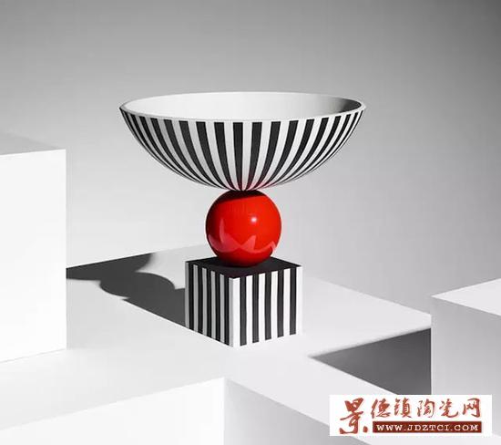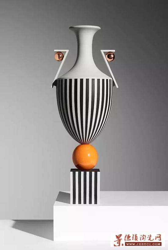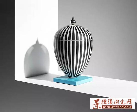Broom 在研究了各個時期的 Jasperware 花瓶輪廓之后,決定沿用它的輪廓。但他并沒有使用經(jīng)典的淡藍色,而是給 Jasperware 刷了黑白相間的條紋,并且上了一層光亮的釉色。
