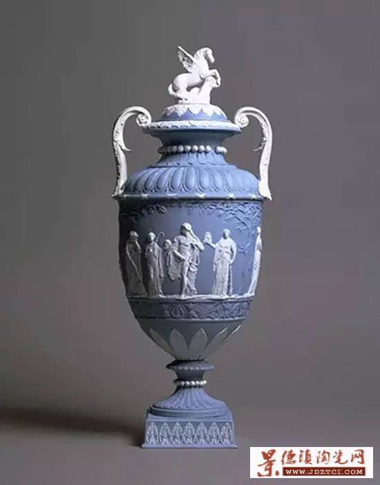 第一只 Jasperware 的誕生是實驗了 3000 多次以后的成果,它呈現(xiàn)出獨特的藍色,被稱為“Wedgwood 藍”。這個系列的花瓶通常不會被上釉,并不光滑的表面加上白色的浮雕(它們大多還與古羅馬、古希臘或者古埃及的神話人物相關(guān)),整個系列都呈現(xiàn)出典雅的新古典主義風格。