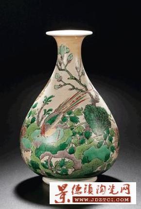 此件玉壺春瓶撇口,短頸,頸以下漸向外闊,至近底處內(nèi)斂,圈足微外撇。其腹部渾圓大氣,身形挺拔壯碩,予人典雅尊貴之感,有明顯繼承明末玉壺春瓶式 的痕跡,線條圓潤(rùn)敦實(shí),少了一絲秀雅,多了一份雄渾,瓶身通體上米色釉,上釉旋轉(zhuǎn)痕跡明顯,主體紋飾于米黃色釉上以五彩繪洞石錦雞玉蘭牡丹紋,寓意錦上添花,玉堂富貴,所繪紋飾工細(xì),全部圖案均以墨線描邊,然后在輪廓內(nèi)填彩。紋飾圖案繁復(fù)工整,于錦俏熱鬧之余,尚有一絲文人畫(huà)氣息,靈動(dòng)鮮活,惹人喜愛(ài),而此瓶之紋飾與釉彩裝飾,則相對(duì)特殊,色地加彩在康熙之前的五彩器物中比較少見(jiàn),明代曾有罐、爐一類以紅綠彩為地的彩繪器,但裝飾手法較為單一,所用顏色也相對(duì)簡(jiǎn)單,而此件器物則安排了綿密繁復(fù)的圖案及畫(huà)面,雉雞紋的形象源自中國(guó)特有的鳥(niǎo)類紅腹錦雞,其翎羽華麗,色彩鮮艷,因極具裝飾效果,所以古人常以之入 畫(huà),又因?yàn)槠渖嗜A麗,又有錦繡繁華之意,配合其周邊所繪的竹石牡丹及玉蘭花卉,寓意吉祥,此圖案為康熙朝經(jīng)典裝飾紋樣,在青花及青花五彩器物中反復(fù)出現(xiàn),可資參閱的例子也較多,后世有所繼承。在米釉上繪五彩紋飾為康熙朝新創(chuàng)裝飾方法,殊為罕見(jiàn),即便是康熙本朝器物,也不為多見(jiàn),因與之相類者寥寥,所以此風(fēng)格的玉壺春瓶于拍場(chǎng)更是十分稀見(jiàn),目前已知北京故宮博物院有一件清宮舊藏的米黃釉五彩玉壺春與之風(fēng)格相同,但紋飾有所差別,高度略高于本件,且瓶底同 樣無(wú)款。